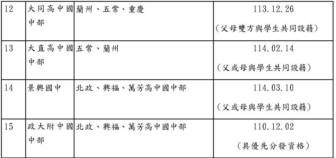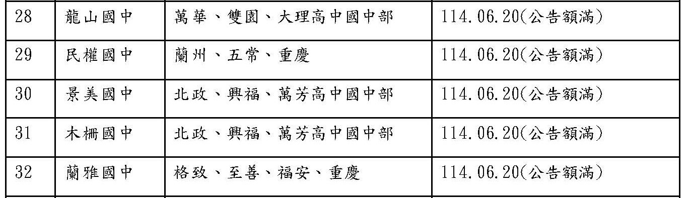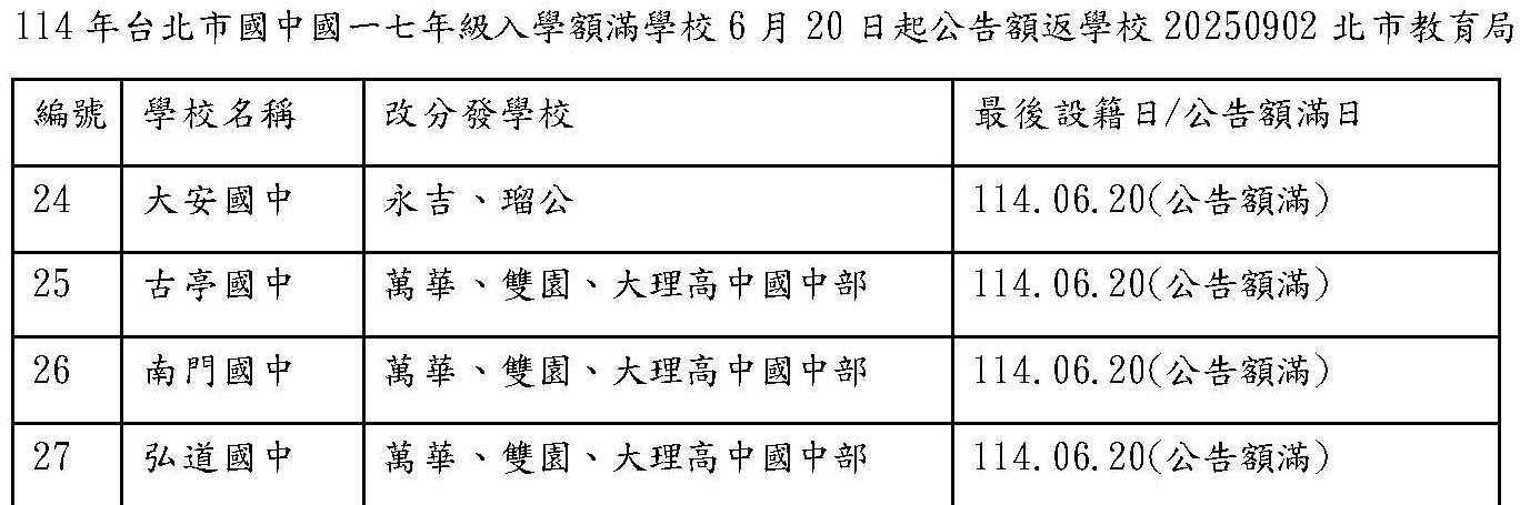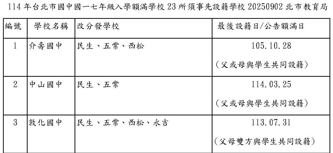 【情報】114年台北市國中國一七年級入學額滿學校 23所須事先設籍學校