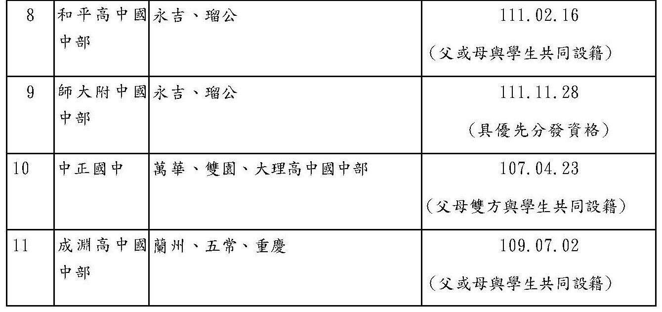 臺北市111學年入學國一額滿國中暨改分發學校名單