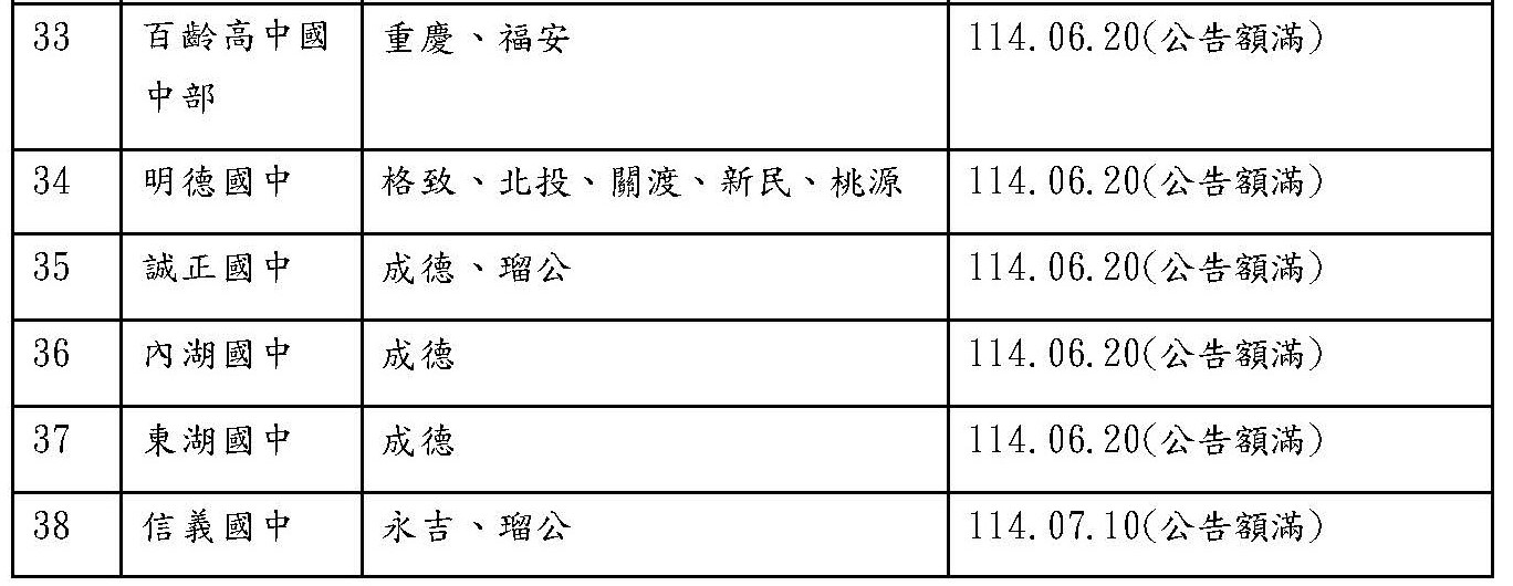 臺北市115學年入學國一額滿國中暨改分發學校